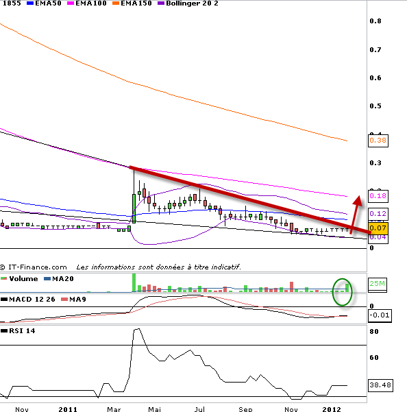 Pour ceux qui veulent spéculer et qui ont le coeur bien accroché, il y a une possibilité d’investir une partie de vos bénéfices récents dans l’action 1855, une penny ++, avec un sérieux risque donc mais qui graphiquement parlant uniquement s’annonce être dans un contexte assez explosif sur ce genre de titres. Bien entendu ne placez pas plus de 10% de votre portefeuille, si la spécu ne prends pas, on peut rester bloqué un moment sur ce genre de titres. Cela relève donc plus d’un pari que d’un investissement mais à la vue des volumes récents, il vaut sans doute le coup de s’y attarder surtout dans un contexte de marché où tout monte.