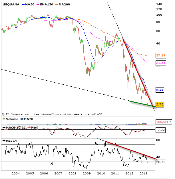 Sequana est une action que j’ai commencé à suivre grâce à Fab56. L’action s’approche d’un niveau de rebond même si à ce stade difficile de dire quel est le point bas. Ce qui est certain c’est que chaque baisse rapproche le titre d’un rebond technique. rebond technique qui sera la première étape à la mise ne place d’une configuration de fin de baisse. Mettre un terme à une lourde phase baissière n’est pas chose aisée, il faut bien de rebonds techniques et rebonds avortés avant de voir émerger une configuration de fondation d’une prochaine hausse. Il est donc encore trop tôt pour se réjouir quant à l’action Sequana. Trop tôt pour acheter les yeux fermés et à long terme.