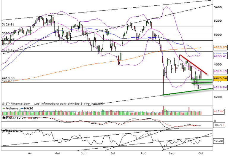 Continuation haussière aujourd’hui sur le CAC 40 en début de séance avec cette volonté de tester la moyenne mobile à 20 jours et le trend baissier en rouge. Violent échec par la suite qui nous renvoit sur l’importante zone de support 4380-4410 points et donc le gap haussier ouvert hier. On est maintenant capable de voir la figure de compression en cours dans un triangle. Pour initier un mouvement haussier de rebond durable, il faudra s’affranchir de la moyenne mobile à 20 jours, ce qui nous permettra d’aller chercher la zone des 4750-4775 points. Je doute que le marché aille rompre par le bas les 4300 points soit le support oblique. Je privilégie le scénario haussier, mais dans toute stratégie il convient d’avoir un plan B. Si nous devions refermer le gap de la zone 4380-4400 points, alors la zone des 4310-4330 serait envisager pour un nouveau test. Tenir cette zone est primordial au lancement d’un rebond plus durable. Ne pas tenir cette zone relancerait une baisse panique sur le CAC 40 vers les 4090 points. Ce n’est pas le scénario que j’envisage pour le moment. je pense plutôt que la zone des 4330-43880-4410 est une zone d’achat pour privilégier une relance haussière vers 4775 points. Mais il faut garder ce garde fou sur une rupture des 4300 qui annulerait ce scénario et relancerait une baisse.