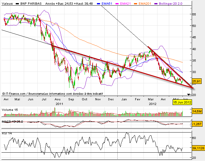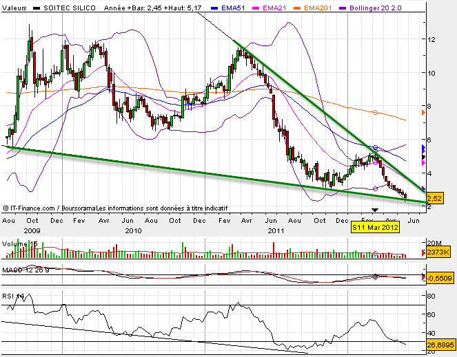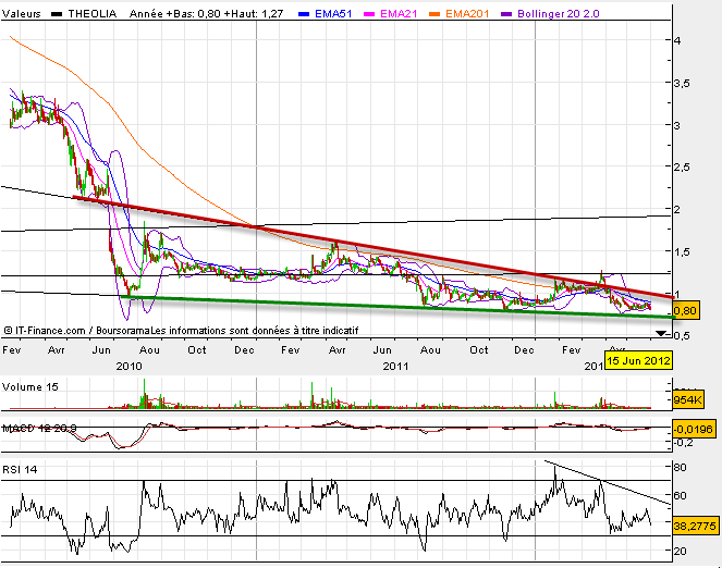 il y a trois actions que je suis de très près pour les acheter au sein de mon pea. Ce sont BNP paribas, theolia et soitec silicon. Je ne m’intéresse pas à ces valeurs parcequ’elles ont énormément chuté au cours de l’année mais parcequ’elles forment des figures de congestion en biseau descendant particulièrement long et donc pertinent aux yeux du marché. Pour moi ces trois actions offrent des achats au titre d’investissement long terme. Theolia a un support sur les 0,72 euros et une résistance sur 0,97 euros. Soitec silicon elle possède le support sur 2,50 euros résistance 3,35 euros. et BNP résistance en cours de test. Le but ici est de faire un investissement long terme. 50 % de position à l’intérieur de la figure et 50 % sur cassure effective voir sur pullback. Pour moi theolia semble la plus prometteuse mais Soitec et BNP celles qui devraient offrir le plus de potentiel de rebond à court terme. BNp est un graphique journalier alors que Theolia et Soitec sont en hebdo