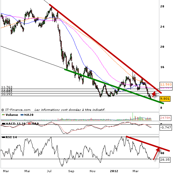 L’action Peugeot a bien souffert depuis quelques mois et accuse une baisse 5 fois supérieure à celle de Renault. Ce qui laisse présager d’arbitrages dans le cadre d’un rebond technique. Ensuite sur le graphique en données journalières ci-dessous on voit que le titre évolue dans un biseau descendant sous une oblique pentue qui détermine une tendance haussière baissière à long terme sous les 11,75 euros. Les investisseurs long terme resteront donc à l’écart sous ce niveau. Cependant pour les investisseurs court terme le niveau actuel semble un bon niveau pour rebondir et viser avec la cassure des 9,85 euros le niveau des 10,15. Prenez donc position à l’achat sur Peugeot sur débordement des 9,85 puis des 10,15 euros. L’objectif haussier sera sur 10,90 euros puis en cas d’emballement 11,30 euros.