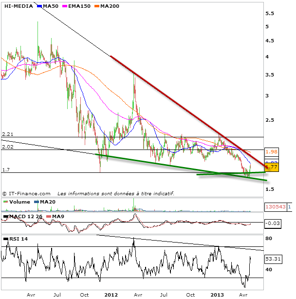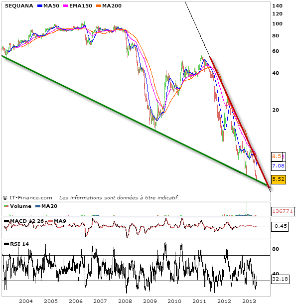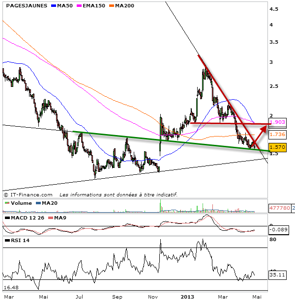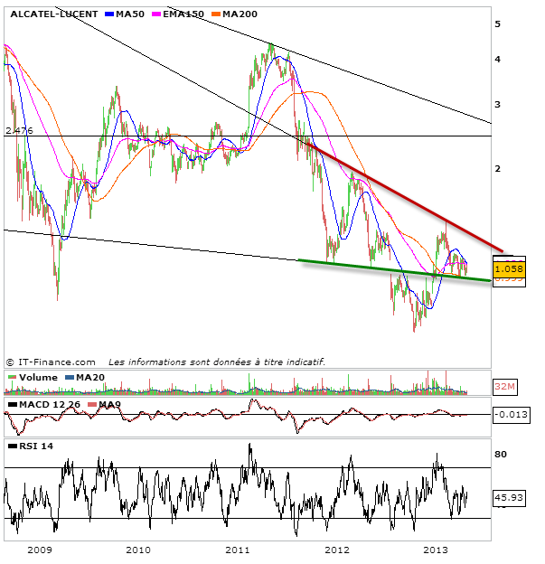 En ce dernier weekend d’Avril et alors que nous allons bientôt entendre des sell in may and go away à tout bout de champ, je voulais vous présenter une série de quelques actions, massacrées actuellement ou qui ont été massacrées ces derniers mois. Ces actions se retrouvent aujourd’hui soit dans des configuration de rebond technique soit dans des configuration de congestion de fin de baisse. Bien entendu, les investisseurs s’intéresseront à celles dans des figures de fin de baisse, et les traders, plus court terme à celles dans des configurations de rebond technique. Vous remarquerez parmi les propositions de nombreuses actions dans des biseau descendant. Les biseaux les plus pentus témoignent d’un potentiel spéculatif de rebond technique. Mois le biseau est pentu et plus la figure en cours témoigne de la formation d’une configuration de fin de baisse et donc si cassure haussière, d’un retour d’une configuration haussière durable. Ces titres là doivent donc particulièrement intéresser les investisseurs. Parmi les titres que je vous propose: Parrot, Sequana, Alcatel-lucent, Pages jaunes, Soitec silicon, Stentys et Hi-media.