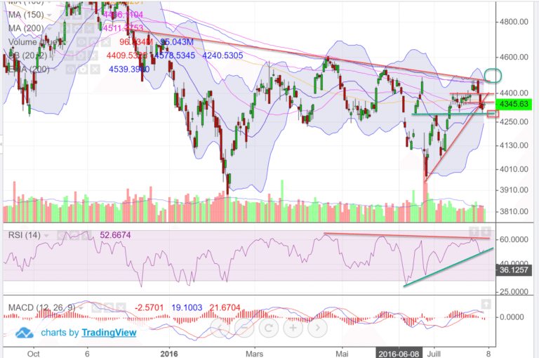 Pour reconquérir, les acheteurs devront franchir 4370 puis 4400-4420. Cela passera forcément par une amélioration sur la situation des banques. Chose qui ne semble pas pouvoir se régler à court terme.
