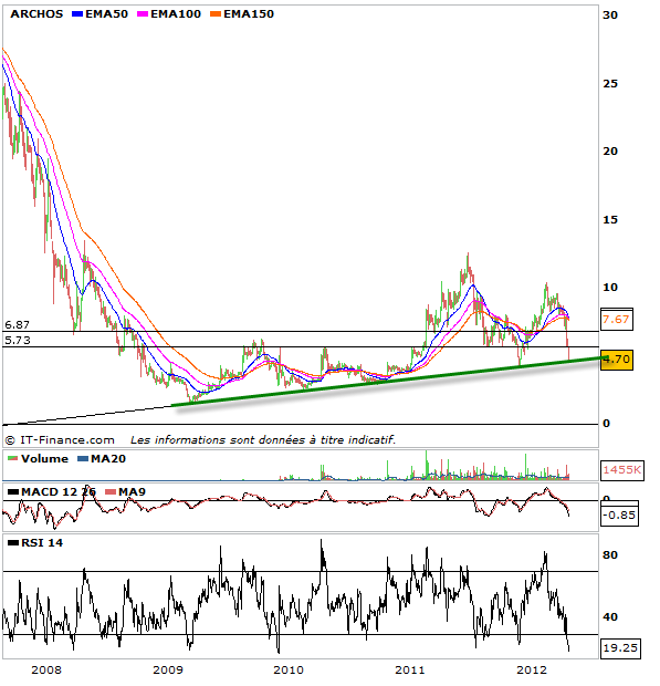Avec une nouvelle séance de forte baisse, Archos arrive sur un support oblique long terme. Délicat de dire s’il tiendra ou pas mais on peu déjà se positionner sur Archos en tant qu’investisseur pour investir dans un rebond durable sur ce support avec comme objectif haussier les 5,70 puis les 6,90 euros. recommandation achat au-dessus des 4,85 euros.