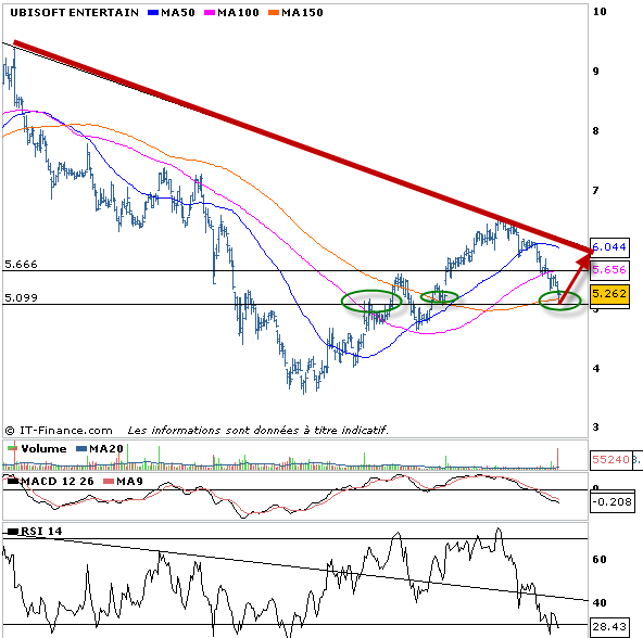 J’achète également des actions ubisoft. Là également on est revenu sur un support important qui devrait jouer son rôle. On vise qu’un rebond technique pour le moment en direction de la zone 5,60-5,80 euros. Seul un dépassement de cette zone relancerait une tendance haussière durable. pour le moment donc, on ne joue que le rebond sur ubisoft.