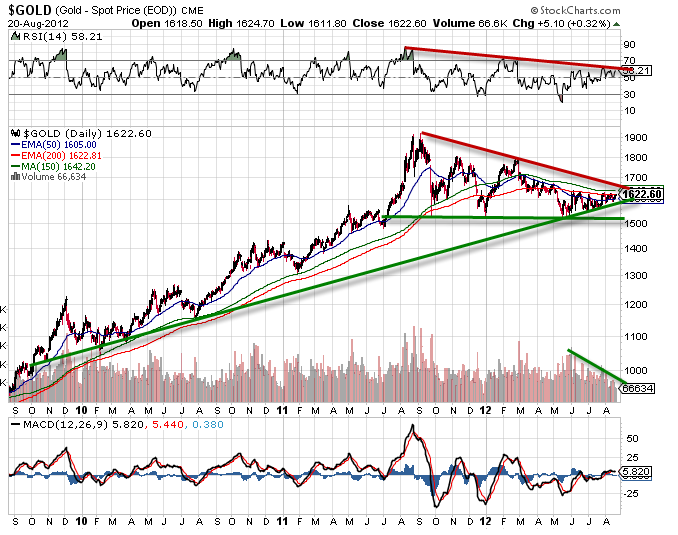 Je n’aime pas l’or. ce n’est pas nouveau et cela m’a valu de ne pas participer au fort mouvement haussier de l’or ces dernières années. Ce n’est donc pas pour radoter mais voilà plusieurs mois que la tendance de l’or végète dans un triangle descendant. Résistance oblique et support horizontal. Certain peuvent voir également un support oblique. La tendance haussière commence sérieusement à s’effriter. Et sans mouvement rapide à la hausse dans les tout prochains jours, la tendance haussière de l’or pourrait bien vivre ses dernières heures et on pourrait se lancer dans une correction baissière du mouvement haussier engagé depuis 2003. Méfiance donc pour les investisseurs en or d’autant que la poussée comme des champignons d’entreprises vous rachetant votre or prouve que la bulle est bien présente. Et souvent juste avant l’explosion d’une bulle, les premières arnaques sont mises à nue. Souvenez-vous de l’affaire Madoff. Et Maintenant dans les dernières actualités en Pologne suivez cette grande arnaque de l’entreprise Ambergold, quelques extraits en dessous du graphique.