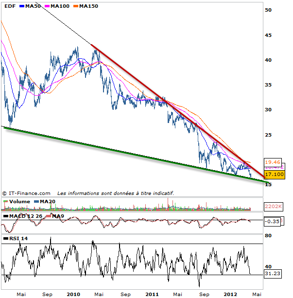 Vous rentrez du boulot et là vous entendez que EDF vient de rafler tous les contrats pour les eoliennes off shore. Petit coup d’oeil sur le graphique d’Edf, et après une sousperformance claire ces derniers mois on constate l’évolution dans un biseau descendant qui arrive à son terme. Le chandelier du jour est un marteau, en bref une réaction acheteuse forte sur un support, première étape en place pour un retournement de la tendance d’EDF.