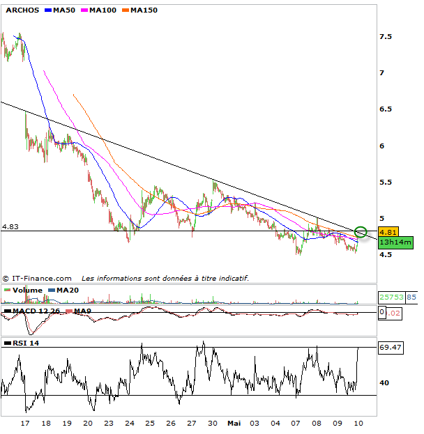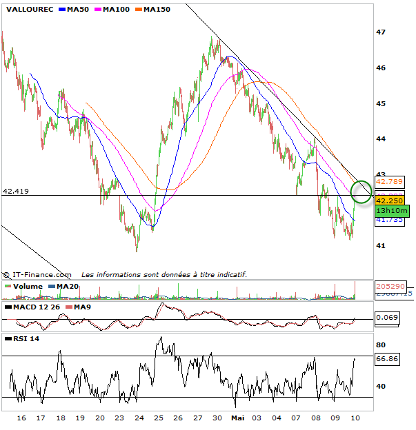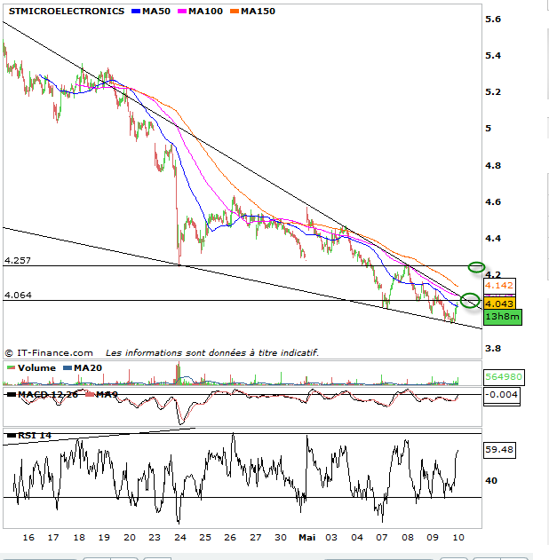 Avec la poursuite de la baisse dans le biseau descendant, il convient d’ajuster les prix d’achat sur rupture de résistance à la baisse. Voici donc les valeurs que je suis et les niveaux d’entrées que je surveille et que je conseille pour les investisseurs, car à titre perso je rentre bien souvent pas anticipation ce qui n’est pas moindre risque certes mais je sais également couper rapidement ce qui pour ceux qui n’ont pas accès aux marchés tout le temps peut s’avérer difficile. Pour Alcatel je suis à achat au-dessus des 1,14. Pour theolia je ne change pas mon point d’achat sur 0,84 euros.