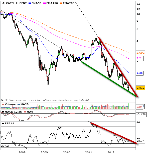 Je reviens sur l’analyse de l’action Alcatel et les prévision que l’on peut faire pour la tendance d’ici fin 2012. Voilà plusieurs semaines que l’on peut affiner une figure en biseau descendant, surtout sur le graphique hebdomadaire. Comme vous le savez, c’est le genre de figures que j’affectionne et aime trader lors du break-out. Bien entendu il est encore trop tôt pour savoir si la cassure se fera bientôt. Une baisse est toujours possible et il convient donc d’encore se protéger.