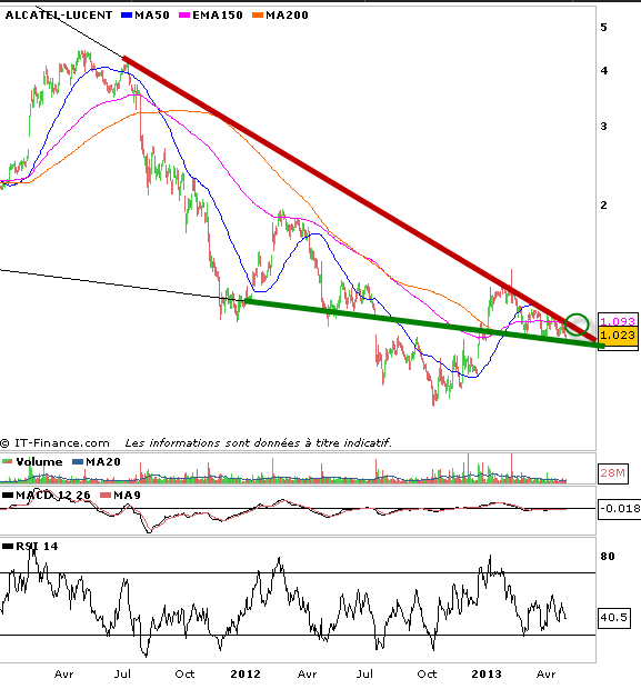 Alors que le CAC 40 franchi un nouveau plus haut et que beaucoup d’actions ont pu nous donner entière satisfaction. Je continu de suivre de très près l’action Alcatel. Voilà quelques semaines j’avais pu vous proposer sur l’action Alcatel une figure de congestion en cours, sans doutes une figure de fin de baisse et de mise en place d’une tendance haussière durable. Encore faudra t-il rompre par le haut cette figure. Quoiqu’il en soit je crois important de faire ce weekend une piqûre de rappel puisque Alcatel se trouve maintenant proche de la fin de cette figure et va donc nous donner bientôt son verdict. Ceux qui anticipent auront pu profiter du support oblique de ce biseau descendant. Alors que ceux qui veulent investir à moindre risque, patienteront jusqu’a la cassure des 1?08€ pour passer à l’action sur Alcatel.