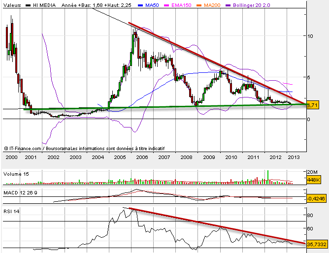 L’analyse de l’action Hi media me fut demandée par un lecteur. En voilà donc une analyse avec un graphique en données mensuelles, ce qu en facilitera la lecture et surtout mon propos. Comme vous pouvez le constater, la tendance actuelle de l’action Hi media est baissière et ce depuis un moment. Nous avons eu un nouvel échec récent avec le non franchissement des 2,25 euros d’inverser la tendance ce qui conduit le titre maintenant à a nouveau tester son support oblique en vert sur le graphique très très long terme. En d’autres mots, il va falloir surveiller prochainement de très près l’action Hi-media. Car si un rebond sur ce niveau semble logique et attendu il va surtout falloir en étudier sa capacité à pouvoir être plus qu’un rebond. Autant dire que ma recommandation pour un investisseur serait de se tenir encore à l’écart de l’action hi media car c’est loin d’être dans une configuration de moindre risque, mais le trader pour un rebond technique pourrait y trouver son compte. A suivre mais avec prudence.