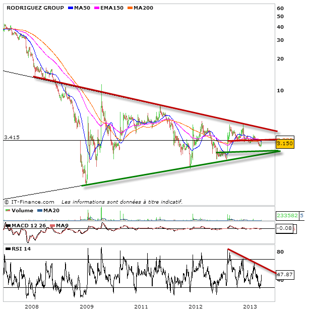 Pour rodriguez group, on demeure dans une très large figure de congestion en triangle isocèle. Cependant, on demeure sous la zone pivot des 3,40 euros. Le risque d’aller chercher le bas de la figure existe donc surtout qu’il y a un gap haussier de ce côté là .