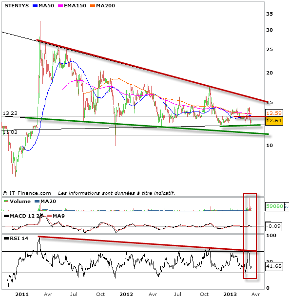 Si les 11,90 devaient lâcher. A fortiori nous aurions à faire à une biseau descendant tracé sur le graphique si dessous qui donnerait un support oblique proche des 11 euros. La figure serait dès lors encore longue, et il n’y aurait pas grand chose à attendre avant le 3ème trimestre 2013 sur  l’action Stentys.