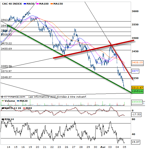 Le CAC 40 en échouant sur la résistance oblique annoté avant hier soir sur les 3475 points, a donc bien validé qu’il se trouvait dans une tendance baissière confirmée. le marché en a donc prit acte en enfonçant les 3430 points, point pivot de signal de vente massive pour tous les intervenants. Les 3350 étaient un objectif baissier mais c’était sans compter qu’avec le temps passé, l’oblique support d’un nouveau biseau descenant avait baissée elle aussi, et on clôture donc pil poil sur le support oblique. Le gap du jour est baissier et sous 3390 points le marché est bel et bien baissier. Seul ceux qui sont devant leur ordi et prêt à trader sur du court terme peuvent tenter en effet ce rebond technique vers les 3350 voir 3370 points demain. rebond technique à priori qu’il faudra confirmer ensuite.
