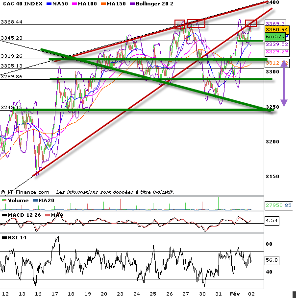 Dorénavant la consolidation ne se relance que sous 3345 points, confirmée sous 3330.
