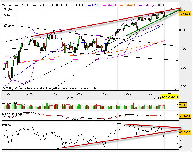La forte hausse du jour du cac 40 ne doit pas vous aveugler. Certes il est certain que le marché est haussier et que chaque baisse sera achetée tant qu’une vraie mauvaise nouvelle ne viendra pas saper l’euphorie haussière, et cela prendra du temps. En effet vous remarquerez que la bourse ne baisse pas forcément tout de suite après l’annonce des bonnes nouvelles, mais il se passe toujours un moment où les marchés ont besoin de digérer les mauvaises nouvelles, pour les intégrer et que les investisseurs réalisent enfin pour que la baisse s’enclenche. En fait, ce qu’il se passe, c’est que dans un marché haussier, il faut avant la baisse, tarir les acheteurs. Et plus le mouvement est fort, plus il faut un moment pour tarir le nombre d’acheteurs. C’est exactement le cas du cac 40 actuellement. c’est pour cela qu’il ne faut pas penser que les baisses se feront fortes et rapidement. Non, il y aura une période d’indécision forte, de yoyo, qui est nécessaire pour tarir petit à petit le nombre d’acheteurs.