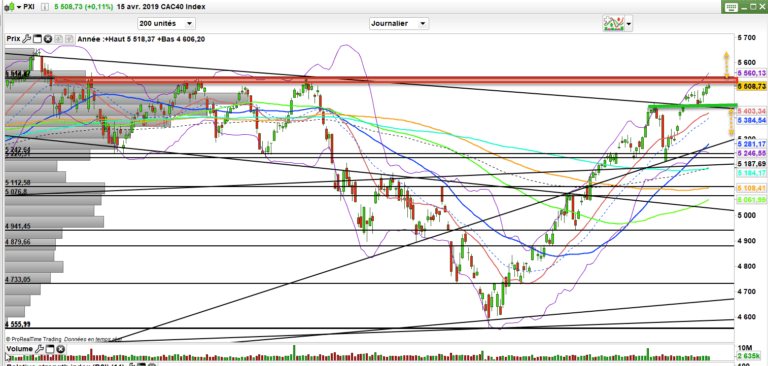 En attendant, on a testé la résistance des 5520-5540 points. La saison des résultats bat son plein et l’enjeu donc de la tendance se tient là. Pur le moment, on voit le luxe, les bancaires, l’auto parfaitement soutenir le marché alors que la fin de la guerre commerciale commence à être un discours usé. c’est bien du coté des résultats d’entreprises qu’il faut regarder.