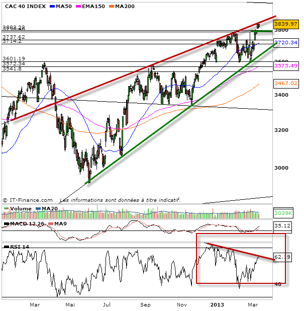 Une nouvelle fois le cac 40 est allé chercher un plus haut en séance. Mais une nouvelle fois cela se fait par des indicateurs techniques qui ne suivent pas et qui démontrent donc une divergence baissière. On attachera surtout de l’importance je pense au rsi qui nous fait certainement un troisième point de contact sur une oblique descendante qui promet, si cela était validée, une certaine correction jusqu’a mi d’année. Nous n’en sommes pas là et les haussiers nous ont déjà donné bien tort voilà une semaine. Mais on ne peut que constater que nous continuons d’évoluer dans un biseau ascendant qui a la fâcheuse particularité de casser par le bas surtout quand les indicateurs et le rsi en particuliers ne suivent pas en faisant eux, aussi des plus hauts. Si cela ne donne pas le timing d’une correction, cela invite, néanmoins à la prudence Sur cette tendance qui je le répète encore une fois se renversera subitement à la moindre mauvaise news interprétée par le marché. Cette hausse est certes une hausse, mais une hausse fragile. prenez donc vos précautions.