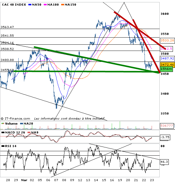 Rebond haussier technique envisageable au-dessus des 3485points (donc si vous avez tenté le rebond avant la clôture, c’est possible mais un peu risqué encore sous 3485).