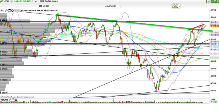 Bonsoir les Graphs, Je vais aller droit à l’essentiel sur le CAC 40. C’est haussier point barre. oui, il faut être prudent. Oui on échoue sur 5500 mais on sauvegarde 5460 points.