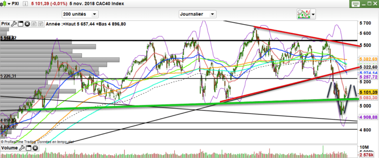 Les acheteurs ont donc le droit de temporiser. cela ne met pas en danger à ce stade le rebond haussier en cours. Mais il conviendra de rapidement s’affranchir des 5120 points pour ensuite pouvoir viser à nouveau 5165 puis 5220 points si jamais l’issue des mid term est appréciée des marchés.