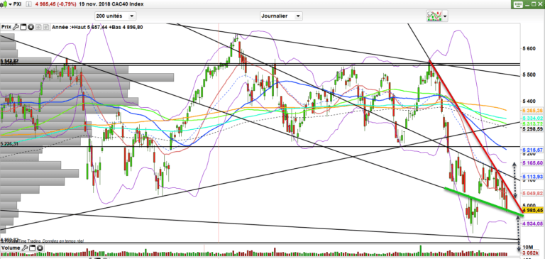 Une nouvelle séance bien compliquée sur le CAC 40. Mais pour le moment cela tient. Cependant, la dégradation est à prendre au sérieux. Alors que brexit et Italie seront au menu ces deux prochains jours avant deux jours de baisse des volumes pour cause de Thanksgiving. Le marché semble vouloir mettre la pression sur Trump pour qu’il signe enfin des accords avec la Chine et soulage les marchés pour Noel.
