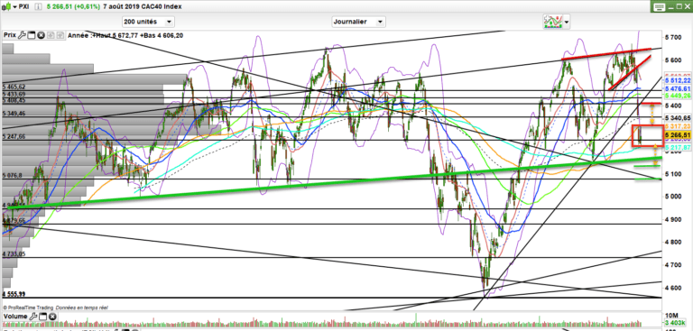 à très court terme, on est neutre, coincé entre les 5230 et 5315 points. Au-dessus ds 5315, on visera 5340. Sous 5230, on ouvrira la voie des 5208 pour commencer puis des 5190 voire 5170 si on devait encore mettre un coup de chaud sur la guerre commerciale.