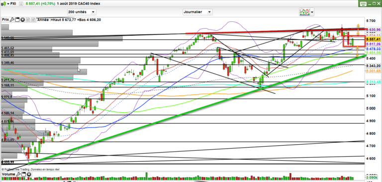 Si on rebondit dessus, cela validera cette oblique et donc la figure comme probante pour le marché et c’est donc celle-ci et sa sortie, dont il faudra suivre la suite pour arguer de la prochaine tendance du CAC 40 pour cette fin 2019.