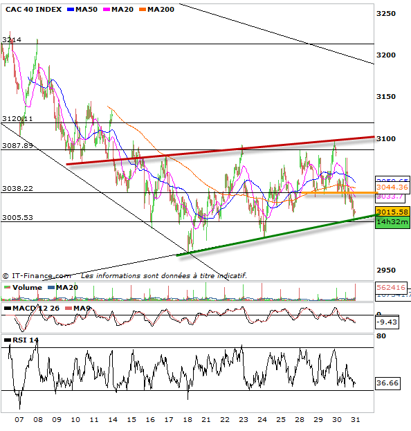 On reste donc dans une tendance neutre dans une figure de congestion 3000-3100 points. Les 3038 points sont pivots. Au-dessus on privilégie à nouveau le rebond du cac 40 au-delà des 3100 points, en dessous on reste attentiste face au risque d’enfoncer le support oblique des 3007 dorénavant et donc de reprendre une tendance baissière d’objectif 2910 points.