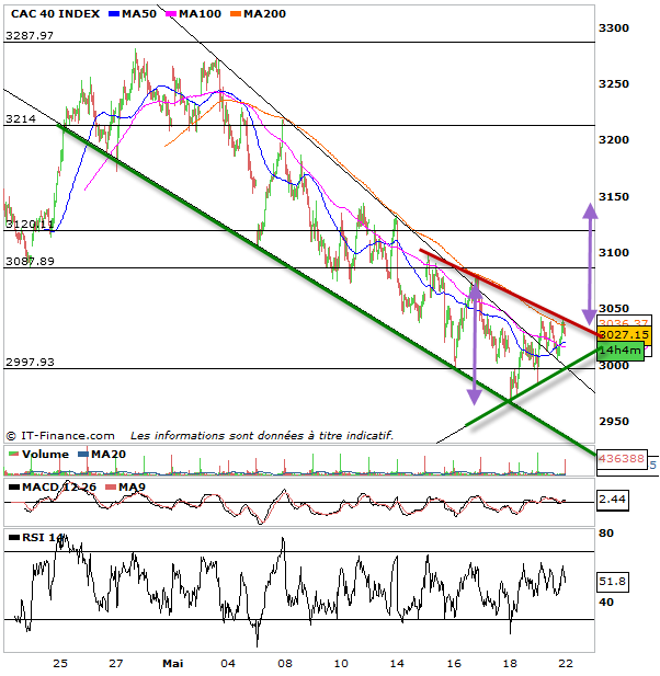 On démarre la semaine plutôt bien sur le CAC 40. On teste les 3043 points et on valide pratiquement l’engagement d’un rebond haussier. Surtout il faut voir dans cette séance l’émergence d’un support tangible ce qui n’était pas arrivé depuis un moment avec les 2997 points. Au-dessus de ce niveau nous validons donc un rebond technique avec comme objectif les 3087 points avant les 3123 points. Attention cependant sous la zone 3087-3123, on ne peut encore considérer toute réaction haussière que comme rebond technique, pensez donc à prendre vos pv quitte à vous replacer.