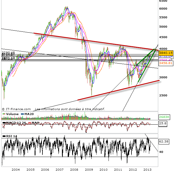 Bref à long terme, clairement, je pense que ce marché à besoin de souffler. Il n’en demeurera pas moins haussier et ira très certainement tester cette oblique rouge. Mais le cac40 le fera t-il maintenant? où consolidera t-il avant de le remonter ? Deux questions, qui à ce soir me sont sans réponse.