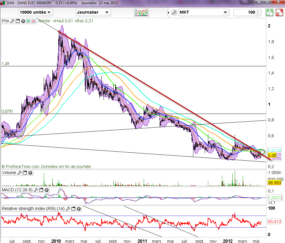 L’action dane elec se retrouve dans un biseau descendant dont une sortie par la cassure des 0,40 euros lancerait un signal d’achat majeur. A surveiller. Attention de ne pas investir plus de 10% de votre capital sur cette valeur.