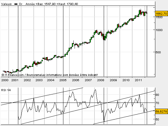 Nous voyons sur le RSI que l’or est dans un canal haussier depuis fin 2008,  sa dernière forte correction. Nous venons de nous appuyer de nouveau sur la borne basse de ce canal et formons un rebond qui ressemble à s’y méprendre à celui de juillet 2005. Si tel était le cas cela irait dans le même sens que pour les indices, c’est à dire qu’il reste de la marge à ce marché haussier tant sur le point de l’amplitude des cours que dans sa durée. Si évidemment l’on compare la situation actuelle  au dernier marché haussier qui c’est finit en août 2007 pour les actions et février 2008 pour l’or.