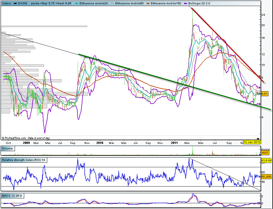 L’action Egide m’apparaît intéressante malgré de faibles volumes. graphiquement on évolue dans une figure de congestion des prix suite à la forte envolée des cours l’année dernière. La sortie de la figure actuelle devrait permettre de mettre en place une tendance haussière durable. Egide est une valeur que l’on peut détenir en fond de portefeuille dans une perspective moyen terme. Je la rajoute dans la watch list afin de la suivre.