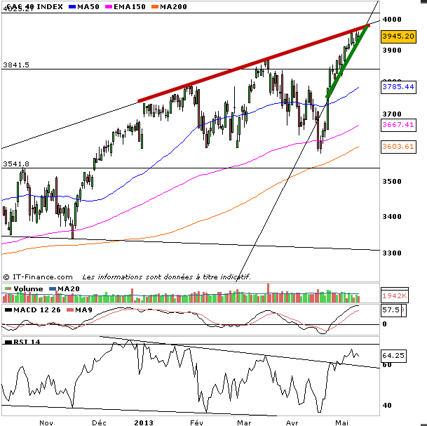 Rien de neuf sur le cac 40. On patine et on hésite toujours à aller chercher les 4000 points. Si bien qu’après l’euphorie les investisseurs pourraient douter sur le franchissement de ce seuil psychologique et vouloir prendre leurs profits amenant une consolidation. Cette consolidation ne remettrait au-dessus des 3837 points comme exposé plus tôt pas en cause la tendance haussière du cac 40. Cependant, elle permettrait à l’indice de souffler pour reprendre des forces pour se lancer à nouveau à la conquête des 4000 points. En attendant on la joue prudent. Et de 3912 points je remonte mon point pivot sur les 3929 points. Très proche des cours donc, pour changer très rapidement mon fusil d’épaule maintenant que le cac 40 rame depuis deux séances. J’ai également profité de mon retour pour charger niveau vente à découvert. A paraître dans un article consacré à la watch list.