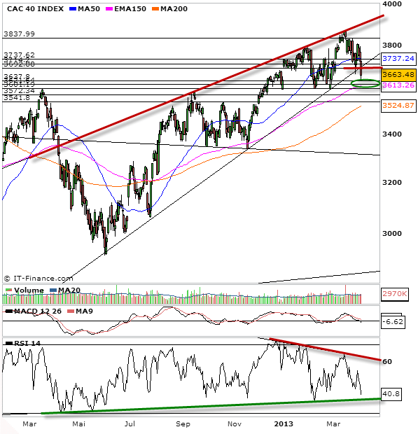 Le CAC 40 a don continué sa consolidation. Depuis la cassure des 3737 points cela ne laissait vraiment plus de doutes, il ne manquait plus que les vendeurs ne prennent définitivement la main en les rompant, ce qui fut le cas. Maintenant que la correction est engagée, l’investisseur doit d’ores et déjà se tourner vers ce qui arrive ensuite. Comme vous pouvez le constater, la correction est là, oui, certes, mais tant que nous évoluons au-dessus des 3600 points, la tendance haussière du cac 40 depuis l’été 2012 n’est pas rompue. Il faut donc garder dans un coin de son esprit que les acheteurs veillent encore et peuvent réagir à tout moment. Il faut donc raisonner par zone pivot comme j’aime le faire. Des zones où acheteurs et vendeurs prennent le dessus et donc nous permettent de suivre la force du vent. Si l’on regarde à long terme donc, cette zone des 3600 points parcequ’elle a servie à de nombreuses reprises de support fin 2012 et début 2013, sera à n’en point douter un gros bastion d’acheteurs.