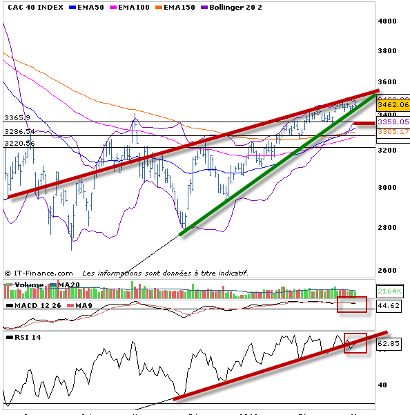 En ce sens le RSi a cassé son trend haussier intermédiaire, ce qui ma poussé à prendre des positions en vente à découvert cette semaine. Graphiquement pour le moment rien n’est validé sur le cac 4à mais on surveille la sortie du biseau ascendant qui témoigne de la hausse inintérompue de l’indice depuis deux mois. Souffler semble logique. Et si on confirme on devrait aller chercher les 3362 points avant un rebond.