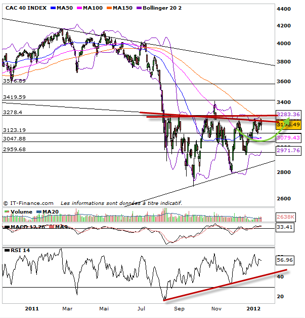 On se doit donc de patienter certainement face à une consolidation qui devrait se faire entre les moyennes mobiles à 20 et 50 jours qui se redressent et la moyenne mobile à 150 jours baissières, voilà donc la zone de congestion dont la sortie sera importante pour privilégier un sens à donner au marché en ce premier trimestre 2012. On estime que sous 3047 points vous pouvez reprendre votre habit bear. En attendant, les plus optimistes croiront en cette capacité du marché à reprendre des forces pour rompre la moyenne mobile à 150 jours à la hausse pendant cette phase de congestion.