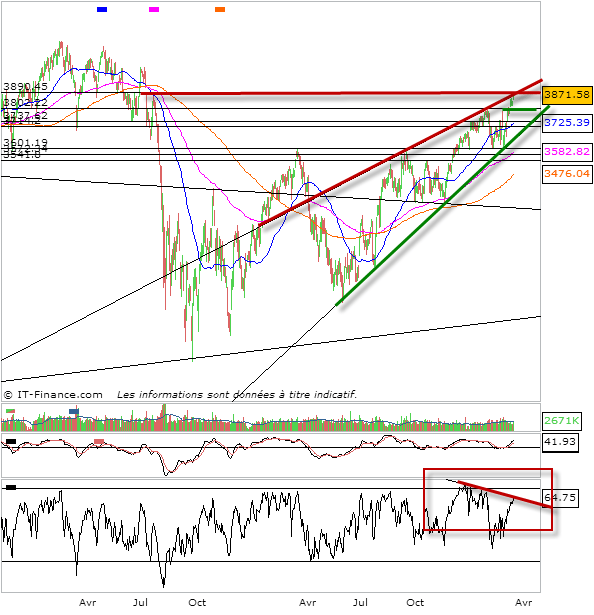 Ainsi, au-dessus de 3830 évitez la contre tendance. Par contre sous 3830 et au-dessus des 3800 il faudra commencer à regarder de près un potentiel retournement en consolidation. Qui sera confirmé sur passage baissier des 3800 points. Sinon, au-dessus des 3830 points. Les haussiers veulent sans doutes accrocher 3890-3910 points. Bien que mon opinion soit que le top est maintenant, très très proche.