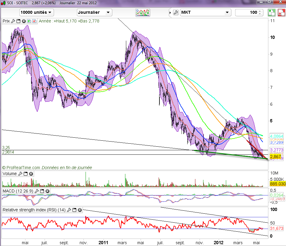 La rupture haussière des 2,98 euros permettrait à Soitec Silicon de pouvoir donner son signal d’achat à son tour et d’aller chercher les 3,24 euros à court terme.