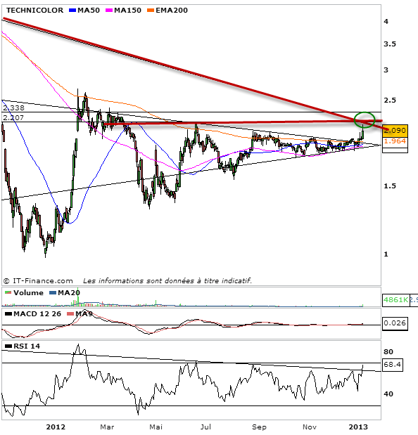 La hausse que beaucoup attendait est donc arrivée aujourd’hui sur l’action Technicolor. Du volume qui plus est, 4 fois plus que sur les derniers jours, qui étaient déjà 2 fois la normale. Le dossier est donc entouré. Mais si Technicolor a débordé une résistance des 2 euros intéressante, cette fois-ci pour de bon, il reste encore du boulot et un goût d’inachevée à la hausse actuelle. En effet j’ai mis à jour le graphique, et on retrouve que la résistance des 2,20€ est bien plus importante que celle des 2€. c’est un double niveau de résistance, d’une part une résistance horizontale, et surtout une résistance oblique dont pour des raisons de lisibilité je n’ai pas montré l’origine. Mais il s’agit de l’oblique baissière de long terme du titre. c’est pourquoi, il faudra que Technicolor confirmer la rupture de ce niveau avant que la hausse s’emballe. Et c’est pourquoi, malgré la hausse du jours, les investisseurs doivent rester prudent face à tout contrepied. On conserve donc l’action, avec la volonté qu’elle puisse confirmer rapidement le dépassement des 2,20€ pour amplifier la hausse.