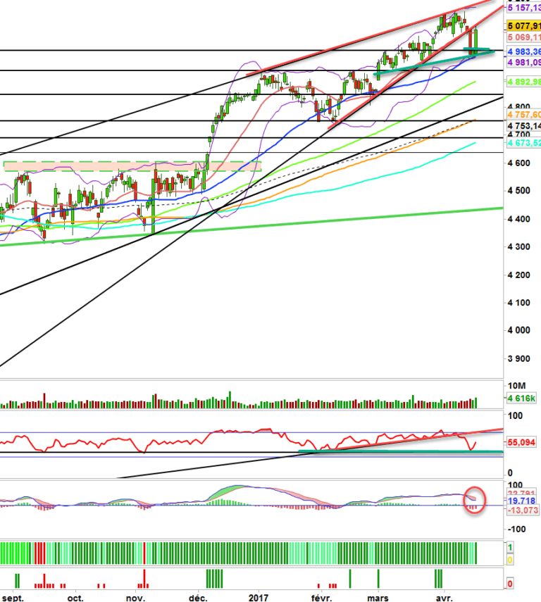 La séance demain, la dernière avant le premier tour, sera donc très intéressante pour voir la capacité des acheteurs de confirmer la hausse du jour. En en étant incapable, on resterait donc en attente des résultats, dans une zone de consolidation, congestion entre 5010 et 5095 points.