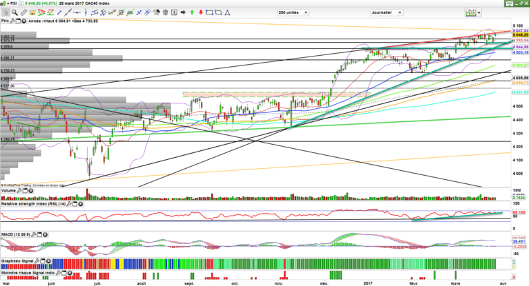 cependant rien ne sert d’être contre marché. la zone des 5050-5070 s’annonce comme une résistance très importante. Malgré la fragilité, le CAC 40 et les acheteurs semblent vouloir le fameux test et contact avec l’oblique baissière de très long terme, une figure de 15 ans sur le CAC 40. Après certainement la consolidation s’enclenchera.