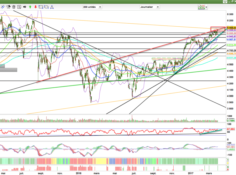 Ce n’est que sous 5034 et à fortiori sous 5000 points que la correction s’enclencherait. à l’heure actuelle inutile de l’anticiper, il faut attendre le signal et suivre la tendance en attendant.