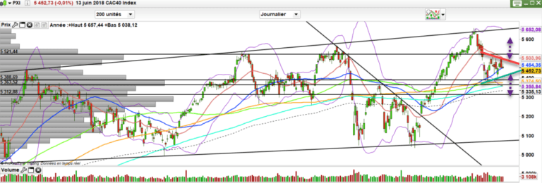 Sous 5450 par contre, la tendance se dégraderait pour venir tester 5420 puis 5400. Sous la zone 5390-5400 les ennuis commenceront et il conviendra d’être très prudent face à la rupture par le bas du triangle et donc au lancement d’un signal de vente en direction des 5360 points en premier lieu, 5330-5310 en extension.