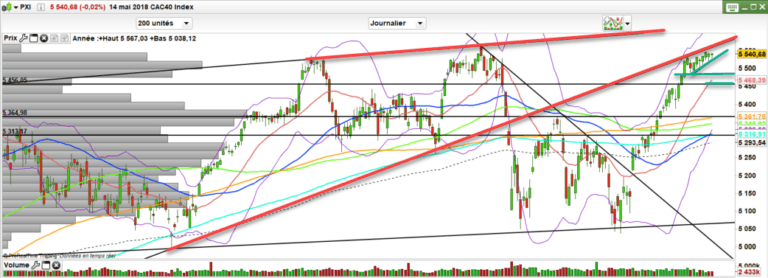La tendance haussière semble vouloir se relancer. Mais pour cela il faudra abattre la résistance des 5540-5570 points. Une résistance majeure. il est donc normale qu’elle procure bien des hésitations.
