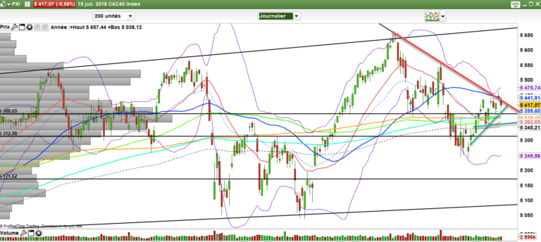 L’été on se doit d’être méfiant car les cassures ne sont pas forcément très confirmées. On a pu le constater avec la fausse cassure hier des 5440 points et de l’oblique baissière. Les choses sont revenues dans l’ordre ce jour. Et donc du coup, nous ne validons pas la cassure et demeurons sous l’importante résistance des 5440-5460 points. Sous ce niveau, les vendeurs gardent la main, et la hausse reste un rebond qui attend donc toujours une confirmation.