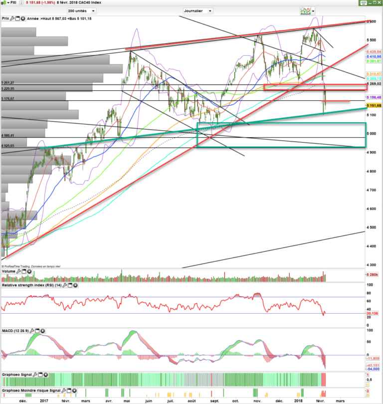 Ainsi le rebond d’hier est parfaitement venu échouer sur les 5270 points. Alors que la consolidation qui s’en ai suivie ce jour est parfaitement revenu d’abord sur les 5230 points puis sur les 5200 points. Les 5200 points ont semblé pouvoir tenir la baraque un temps et relancer le rebond mais qui est venu échouer sur les 5230 points. Cela fût un signal de faiblesse et l’attaque suivante des 5200 n’a pas eu d’opposition. Les 5200 vaincus, le rebond technique avorté, la relance baissière et la volatilité ont pu reprendre leurs droites.