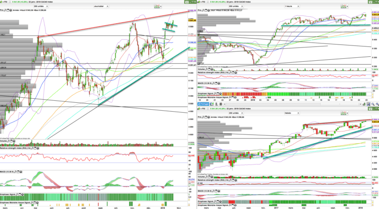 Le mouvement de vendredi, à savoir la cassure haussière d’un drapeau est donc confirmé et ouvre l’objectif des 5585 points.