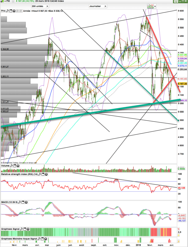 Mais nous n’en sommes pas encore là. Surtout en cas d’échec à tenir les 5125 points, les vendeurs relanceraient une attaque forte avec 5100 puis 5070-5040 à nouveau en optique.